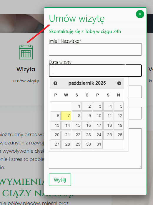 Zadbaliśmy również o możliwość łatwego zapisu na masaż – poprzez intuicyjny formularz z opcją wyboru daty.