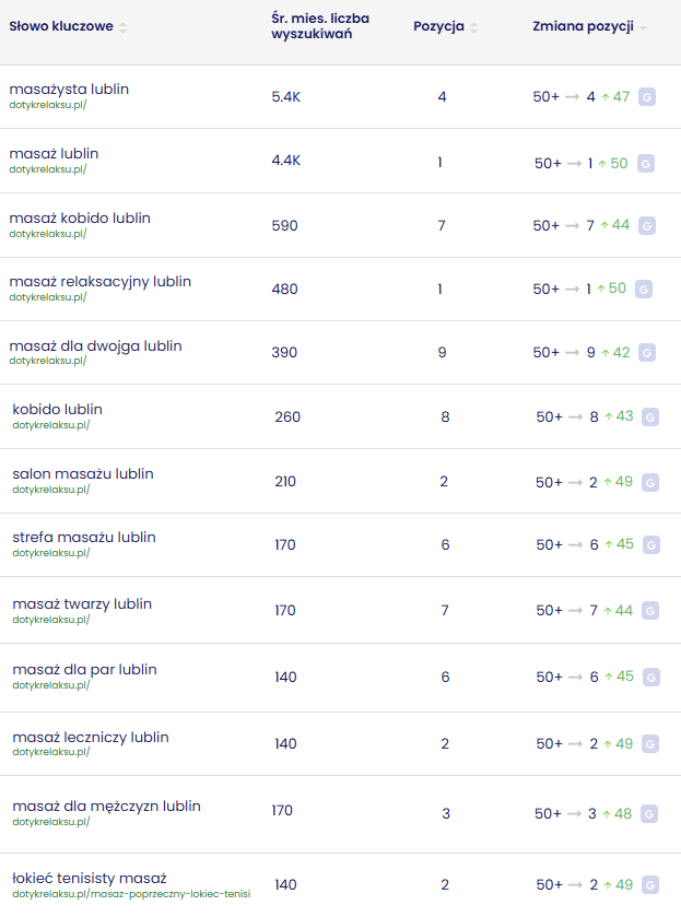 Strona dotykrelaksu.pl zanotowała znaczące wzrosty pozycji dla lokalnych fraz kluczowych odnoszących się do masażu oferowanego przez gabinet w Lublinie. Widoczność witryny w Google znacząco się poprawiła – wiele słów kluczowych przesunęło się z pozycji z pozycji 50+ do pierwszej dziesiątki wyników wyszukiwania.