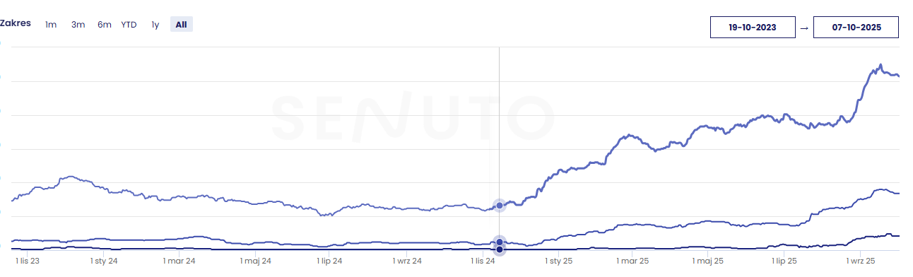 Wykres widoczności w SENUTO pokazuje systematyczny wzrost liczby fraz, na które witryna pojawia się w wynikach Google. Od momentu rozpoczęcia współpracy widoczność rosła w sposób stabilny i zrównoważony, co potwierdziło skuteczność oraz długofalowy charakter prowadzonych działań SEO.
